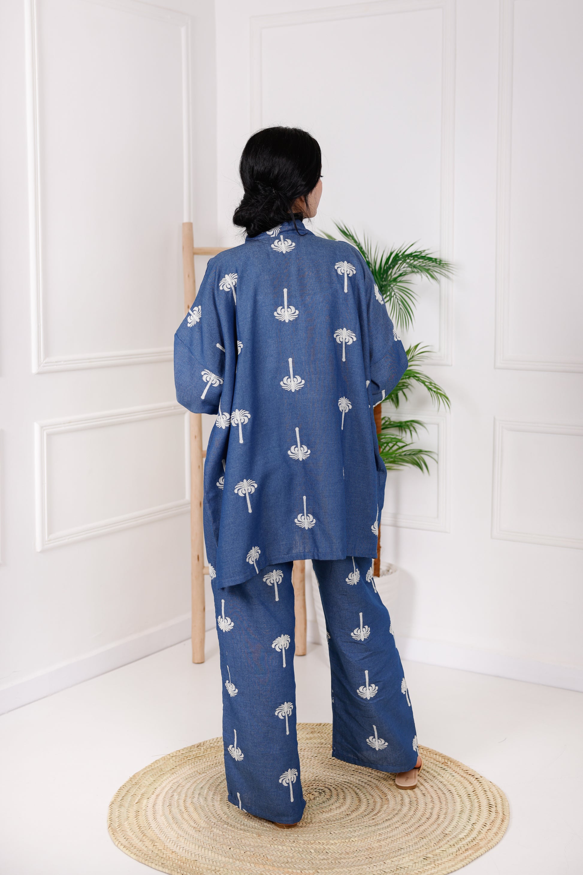 BLEU KECH est un ensemble composé d’un kimono oversize et de son pantalon assorti, confectionné dans un denim léger idéal pour la mi-saison. La coupe ample évoque une allure décontractée et sophistiquée, tandis que les broderies fines en fil blanc, représentant des palmiers, ajoutent une note poétique et dépaysante. Un clin d’œil discret à l’horizon marocain, entre modernité et tradition, pour une silhouette à la fois confortable et résolument stylée.