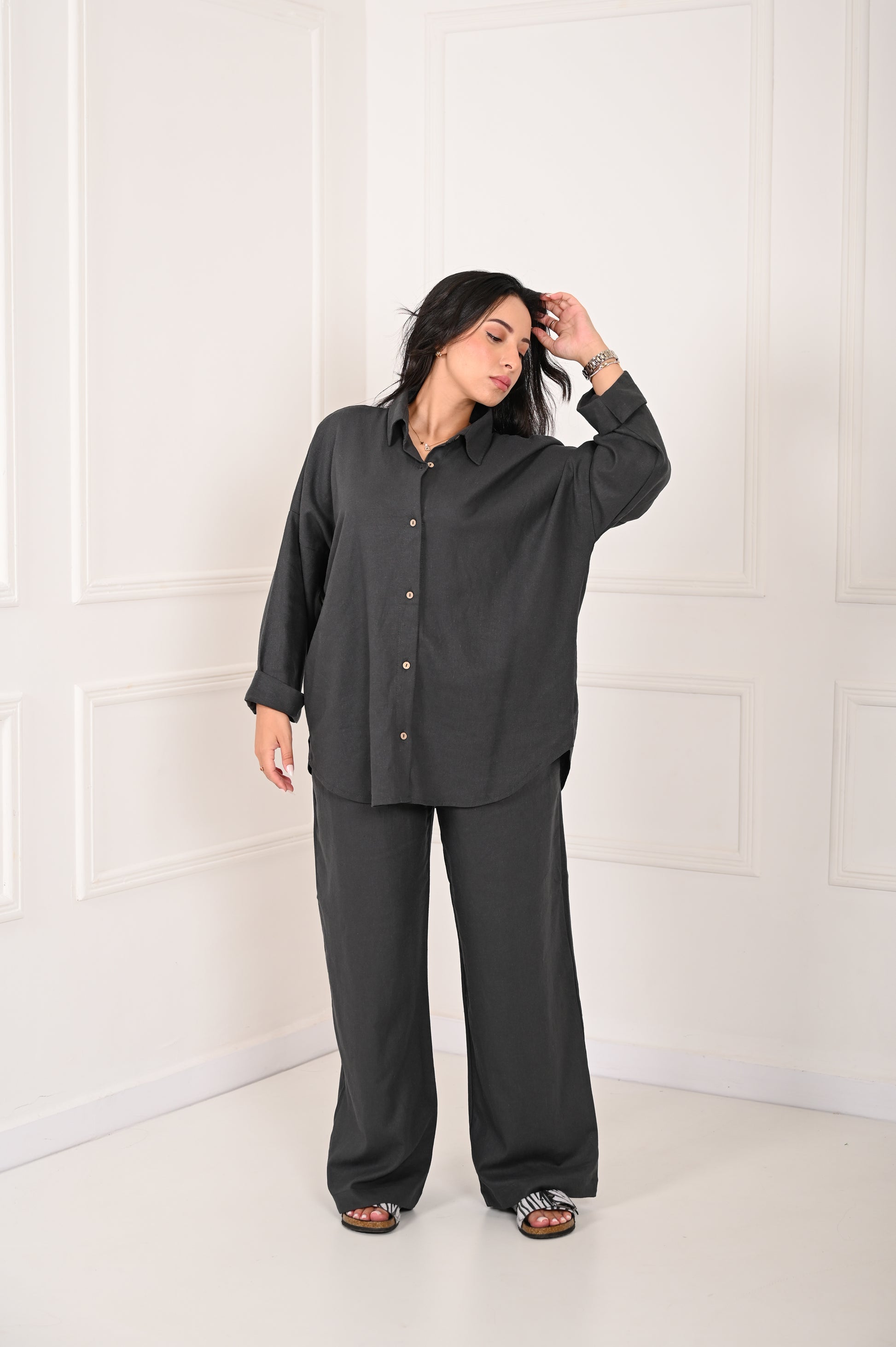 Sobriété et intensité se rencontrent dans l’ensemble Elvia Cendre. Le gris foncé souligne le tombé fluide du lin et renforce le caractère minimaliste et moderne de la coupe.