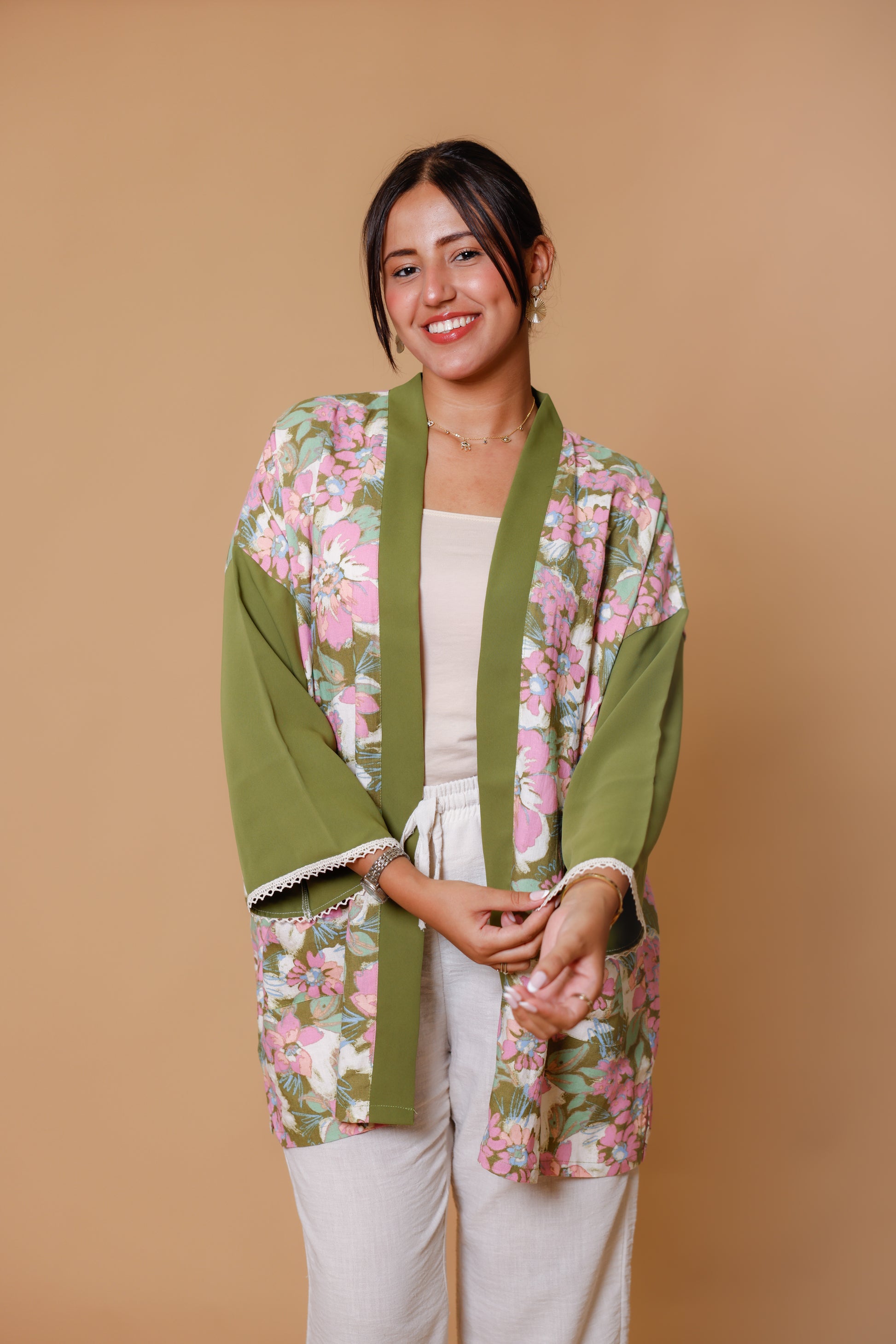 Plongez dans la beauté florale de Verdero, notre kimono exquis orné de motifs fleuris, où les nuances de la nature se mêlent harmonieusement. Avec ses manches d'un vert profond, il évoque la fraîcheur des jardins luxuriants et l'élégance intemporelle. Laissez-vous envoûter par son charme captivant et laissez votre style fleurir avec Verdero.